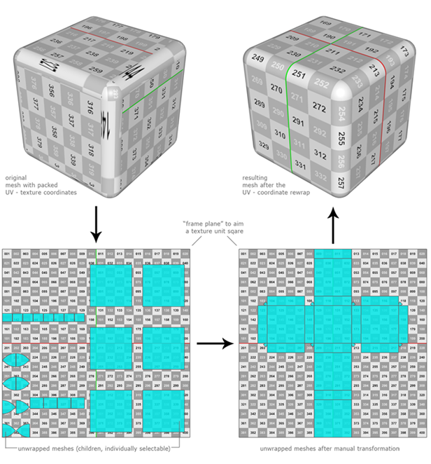 Use: Unwraps a mesh or render mesh to the user definable frame plane. The frame plane is a single mesh quad positioned behind the unwrapped objects to show the assigned texture.