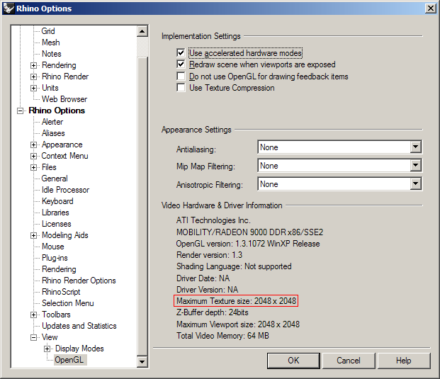 Rhino uses OpenGL to display and draw everything you see in a viewport. Image files, or bitmaps, are treated as OpenGL textures. OpenGL has limitations and specific requirements that must be met to create textures.